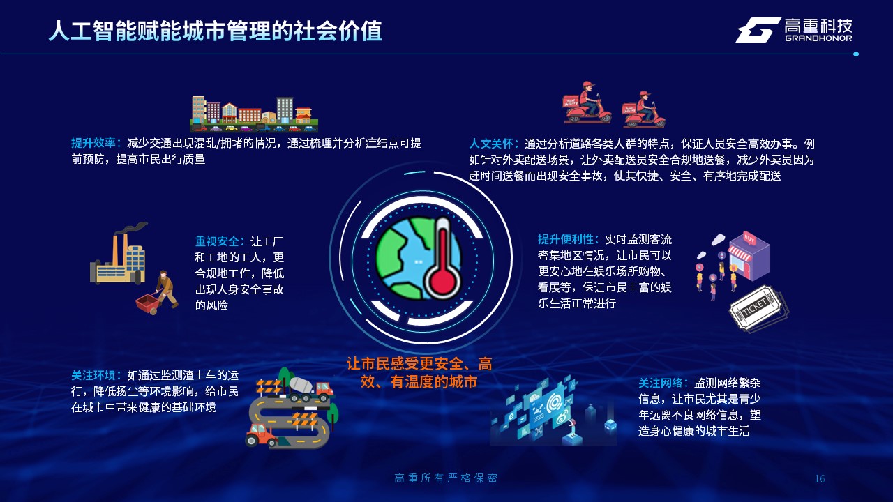 当然,我们不能为了智能而智能,为了建设而建设,而应该始终坚持初心、以人为本,让市民感受到更安全、高效、有温度的城市,这也是我们高重科技一直以来的追求和愿景。