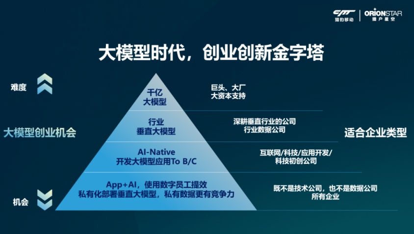 傅盛先生还勾勒出大模型时代创业创新金字塔,顶层的千亿大模型是高度技术的角逐,难度和成本都相当高,但是越往下面机会越多,垂直行业的模型有很大的机会。