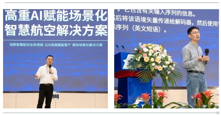 在会议的产品发布环节,高重科技智慧航空研究院院长李超博士首先做了《高重AI赋能场景化智慧航空解决方案》的主题报告,涵盖了智慧航空解决方案的行业趋势、应用领域和市场前景。CTO周江涛先生分享了《Transformer技术在文本及视觉任务中的应用》的主题报告,并进行了智慧农业解决方案及航空大模型的现场发布。